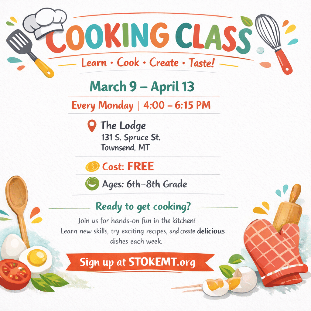 Learn to shop, prep, cook, and ENJOY the food you make! Starting with preparing menus, making shopping lists, and creating skills in the kitchen; we will eat, learn, and even feed your families by the end of a six-week class. If you simply like to eat, cook, or want a new skill for a future job, register for a spot! Only 5 spots available. First come, first serve Registration: Register at stokemt.org. Price: Free Who: Students in GRADES 6-8 Dates: Mondays for 6 weeks: March 9, March 16, March 23, March 30, April 6, April 13 Times: 4:00-6:15 Where: The Lodge of Townsend, 131 S. Spruce, Townsend, MT 59644 How: Complete STOKE Registration Form (Parent signature required for students under 18 years old). For more information, please call: Simone Dominguez (406) 451-1713